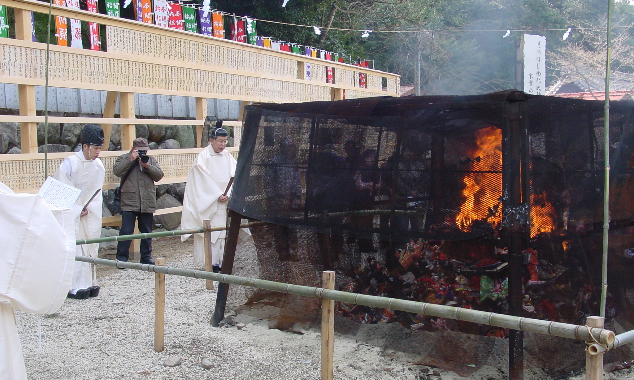 大縣神社では、3月3日桃の節句に併せ、お子様が慈しみ大事にお使いになられ古くなった人形を忌火を以て焚き上げる人形焼納祭を行います。