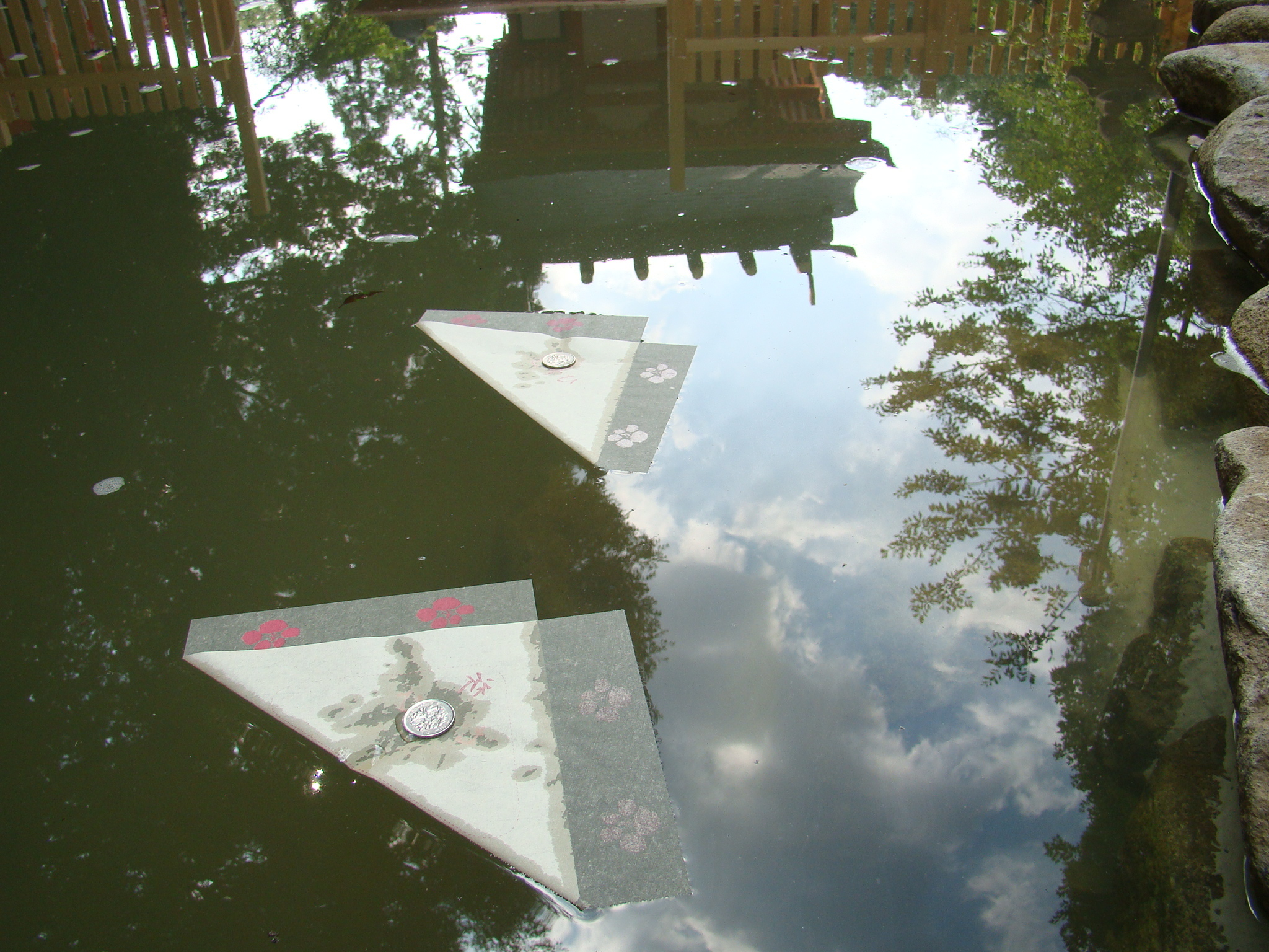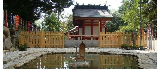 祈願用紙を授与所にてお受けいただきます。次にその用紙に願を書き、もとのように閉じます。その際に願意の上におむすび形の紙を乗せて閉じて下さい。祈願をする際、用紙の中央にお賽銭をのせて水面に浮かべ御祈願下さい。祈願用紙が早く沈めば願の成就が早く、遅く沈むと縁が遠いと云われ、また近くで沈むと身近に、遠くで沈むと遠方に縁が有ると云われております。