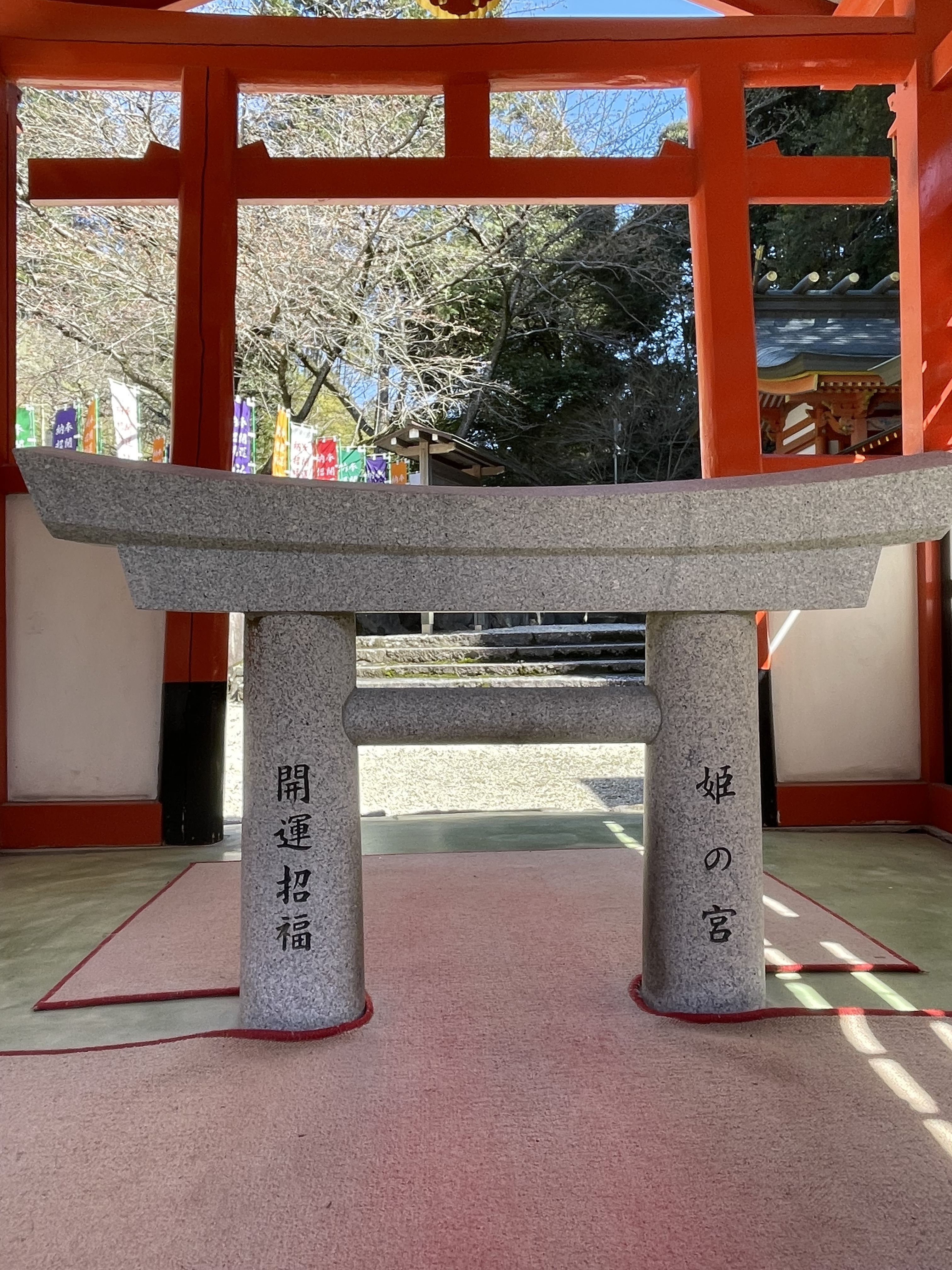 摂社「ひめのみや」はタマヒメノミコトを祀り、安産・子授け・女性の守護神と称えられております。境内には小さな鳥居が建立され「みに鳥居」「開運鳥居」とよばれております。ご自身の願が天に通じる様祈願を籠めて通り抜けて下さい。